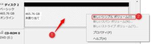 ディスク2の未割り当てと表示されているのが新しく換装するSSDのことです。この斜線の枠内を右クリックし、新しいシンプルボリュームをクリックします。