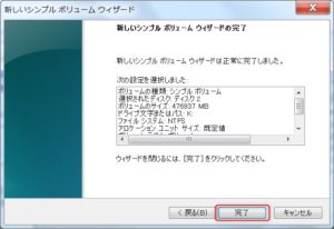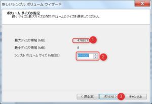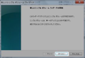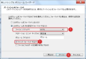 ファイルシステムの部分がNTFSになっていることを確認します。次にクイックフォーマットするにチェックが入っていることを確認し次へ