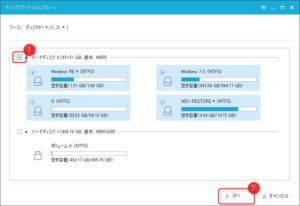 クローン元となるHDDのデータを選択します。すべてクローンしたいので1番のところにチェックをつけて次へ。