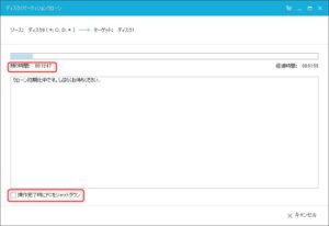 クローン作業が始まります。残り時間が表示されますがどんどん時間が伸びていくのであまりあてになりません。パソコンのスペックにもよると思いますが約2~3時間ほどで終わると思います。終わったら自動的にシャットダウンしてほしいときはチェックを入れておきましょう。